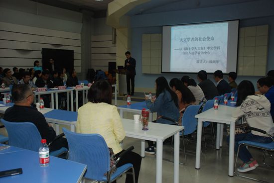 院长韩高年教授作了“人文学者的社会使命——以《陇上学人文存》中文学科10位入选学者为中心”的主题报告。首先,他简要回顾和梳理了我校中文学科自1902年发端至今的历史,并将其划分为四个阶段,介绍每个时段的学术成就和嬗变轨迹。接着,他以《陇上学人文存》丛书为例,具体阐述当前从事学术研究应该如何继承优良学术传统及承担人文学者的社会使命。《陇上学人文存》是由甘肃省省委宣传部和省社科院策划的大型丛书,计划十年内出版十辑100册,目前已出版四辑40册。我校中文学科有赵荫棠、郑文、匡扶、彭铎、郭晋稀、李鼎文、陈涌、黄伯荣、支克坚、赵逵夫等10位学者入选。他们均博学多识,学有专长,成就卓著,堪称楷模。最后,他强调指出,高校教师应该兼顾教育工作者与人文学者的双重身份,要有“执着学术,传承学脉;经世致用,守正创新;普及经典,引领文化”的精神品质。