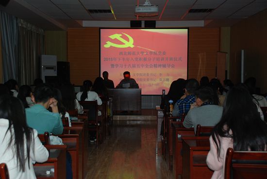 11月12日下午,我院在10号教学楼B座518教室举行2015年下半年入党积极分子培训开班仪式暨学习十八届五中全会精神辅导会。本次会议由学院党委书记聂万鹏主讲,团委老师李力主持,我院40余名入党积极分子参加了此次会议。