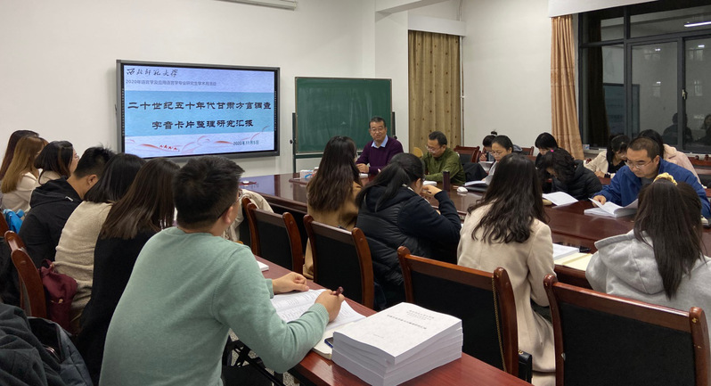 11月5日晚,为进一步促进语言学的学习与交流,在学术月之际,我院语言学及应用语言学、文字学现代汉语专业相关师生在10B402教室举办了甘肃方言字音卡片整理研究成果讨论会。雒鹏副教授、杨同军教授、黄海英副教授、马玉红老师、刘志刚老师以及语言学专业全体同学参加了此次报告会。