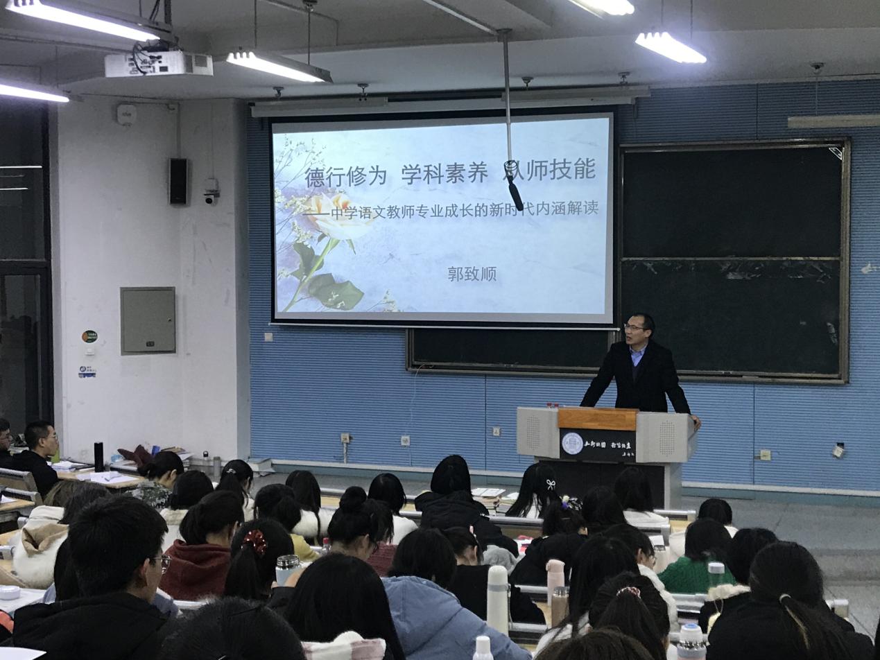 12月16日晚,买球的app排行榜前十名推荐“世纪中文”语文名师工作室系列讲座之十二:“德行修为·学科素养·从师技能——中学语文教师专业成长的新时代内涵解读”专题讲座在教学10号楼A区216室举行。兰州二十二中教务主任郭致顺老师主讲,副院长李明德主持。2020级全体买球的app排行榜前十名推荐本科生参加。