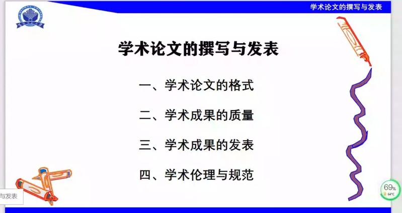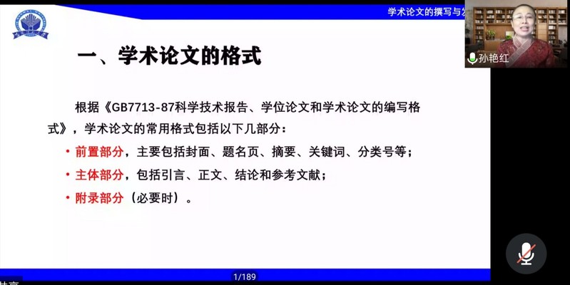 孙艳红教授分别围绕“学术论文的格式”“学术成果的质量”“学术成果的发表”和“学术伦理和规范”这四个方面展开论述。