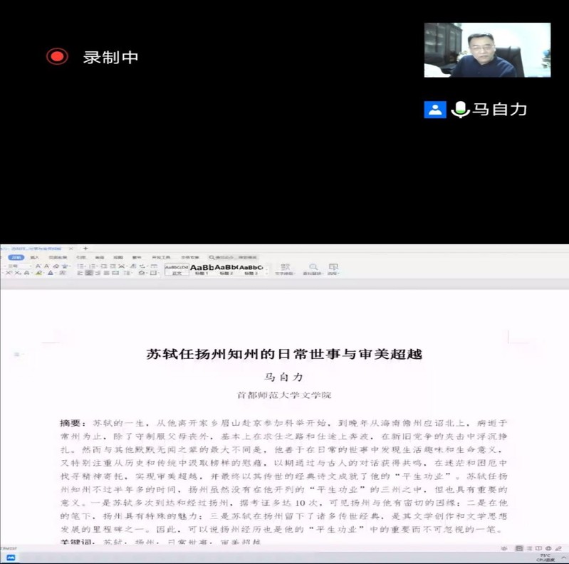 2021年1月22日,应买球的app排行榜前十名推荐邀请,首都师范大学买球的app排行榜前十名推荐院长马自力教授在线作了题为《苏轼任扬州知州的日常世事与审美超越》的学术报告,此次讲座由买球的app排行榜前十名推荐院长马世年教授主持。
