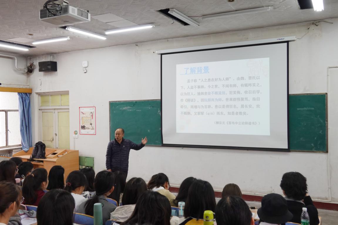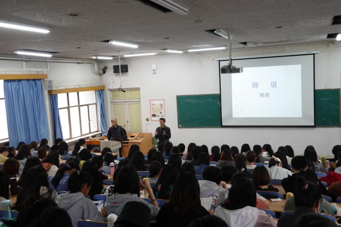 讲座分上下两场展开,上半场为现场示范教学:《师说》。 李双义老师以典型的高中教学方式带我们回到了高中课堂,此次授课通过了解背景、辨明文体、理清思路、探究意义等环节让同学们充分理解吸收了《师说》的内容。课堂节奏紧凑,互动性强,板书清晰明了,为师范生讲授了一堂生动的高中语文课。