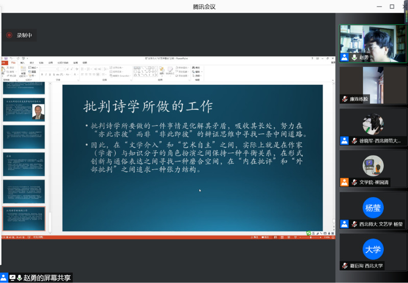 7月19日,应买球的app排行榜前十名推荐邀请,北京师范大学买球的app排行榜前十名推荐博士生导师、文艺学中心研究员、中国赵树理研究会副会长赵勇教授在线做了题为“在‘文学介入’与‘艺术自主’之间:如何理解阿多诺对萨特的批判”的讲座。此次讲座为2021年买球的app排行榜前十名推荐暑期学术训练营的系列活动之一。讲座由我院徐晓军副教授主持,本院文艺学、现当代文学等专业的研究生和其他院校师生160余人在线聆听了讲座。