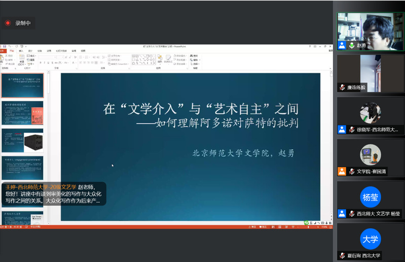 讲座最后,赵勇教授在线上与师生进行了热烈的学术交流与讨论,他针对老师和同学提出的关于阿多诺对新近“新审美主义转向”的影响和启发、本雅明与萨特对待大众文化的异同等问题进行了细致的解答。赵勇教授在理论思辨、文本细读和社会关怀之间大开大合又精微细致的分析,令在场师生受益匪浅。