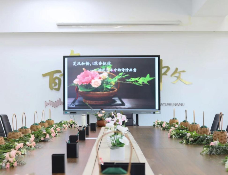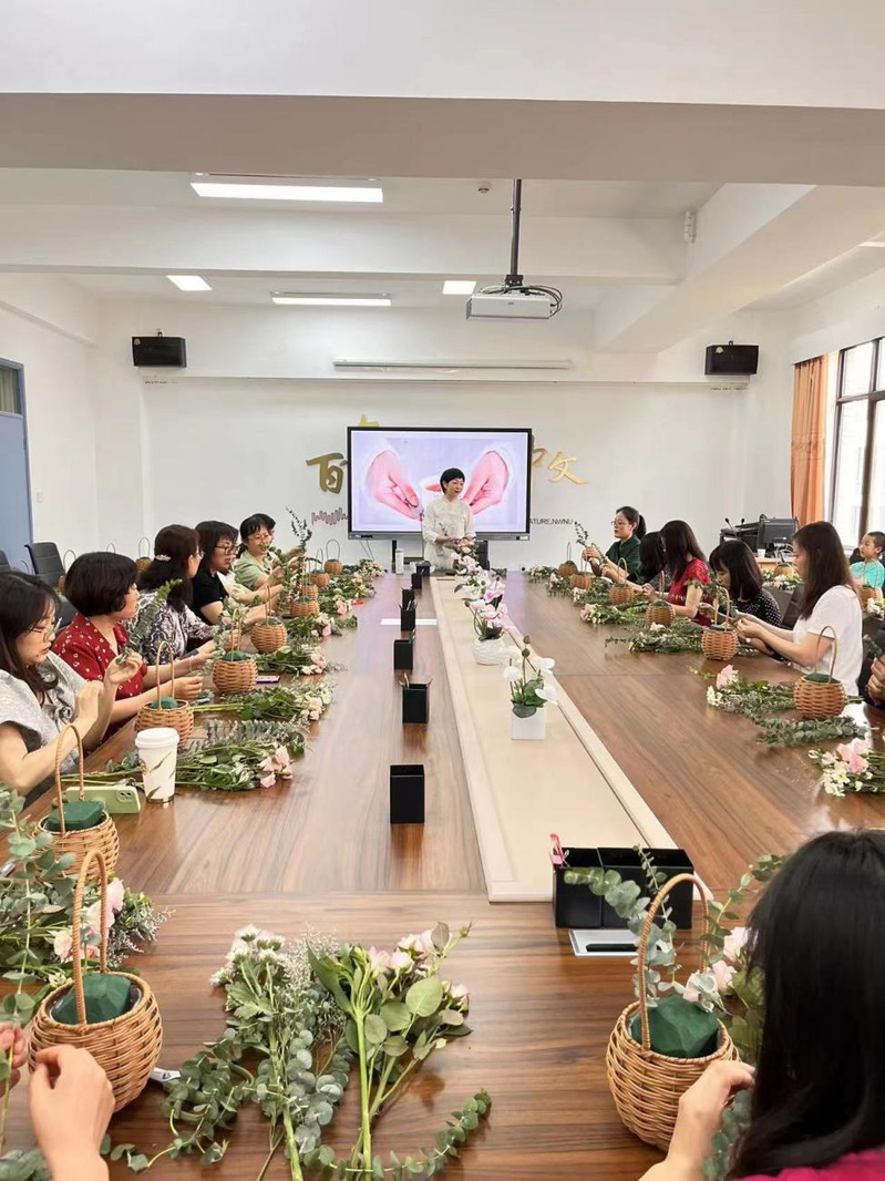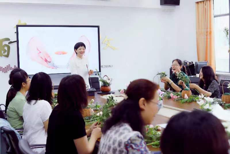 此次花艺活动邀请了莲语学堂的老师为在场教师讲解相关知识,内容包括花道经验交流以和手体验两部分。“彩线轻缠红玉臂,小符斜挂绿云鬟。佳人相见一千年。”中式花艺意境淡雅、中和、悠远、清丽,可以充实我们的内在涵养与修为。朵朵鲜花、枝枝绿叶在老师打量挑选、定位插放之后绽放了自己的新生命。古香古色的花篮逐渐成形、各具特色。
