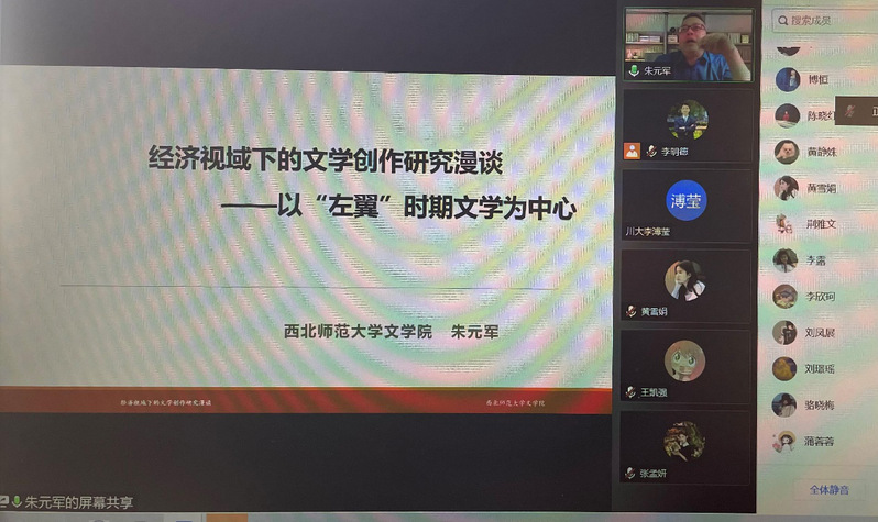 此次讲座从四个方面展开:一是经济视角研究文学概述。介绍了章培恒、金宏宇、刘锋杰、胡明、许建平、李怡等知名学者关于经济与文学关系相关研究的代表论著。并将经济视角文学研究概括为两个维度:一是文外研究,即文学创作之外的经济影响因素研究;二是文内研究,即是文学作品中的经济书写与意义研究。二是左翼文学经济视域研究路径(以左翼小说为例)。分层展开左翼小说的经济视角研究相关代表性著述、关于文学市场研究的代表性学术文献、左翼文学的商业经济相关代表性研究等文献的梳理,形成左翼小说文献综述的整体性关照架构。三是探讨了上海作为左翼时期文学中心市场的形成原因。大量青年知识分子的聚集以及左倾知识分子加入“左联”等情况形成了文学生产和文学消费群体。从经济现代化、教育现代化、出版现代化以及稿酬制度的建立等为上海文学市场的形成与发展、繁荣打下基础。四是以左翼“革命加恋爱”小说的商业化问题作为研究范例,阐述了“恋爱”主题和“革命”主题有机结合形成这一时期文学出版市场一道亮丽的“风景”及其背后的市场运作研究。朱老师认为经济视角对于文学研究而言,还有许多研究空间可以延伸。经济书写与国民经济、地方经济都是一种映射关系,我们的研究可以看到文学中的经济影响,但也要回到文学本身。复杂的经济因素并不妨碍文学审美,反而更能让文学审美更真实、立体和客观。随后,朱老师和大家进行了深入交流,回答了部分问题。