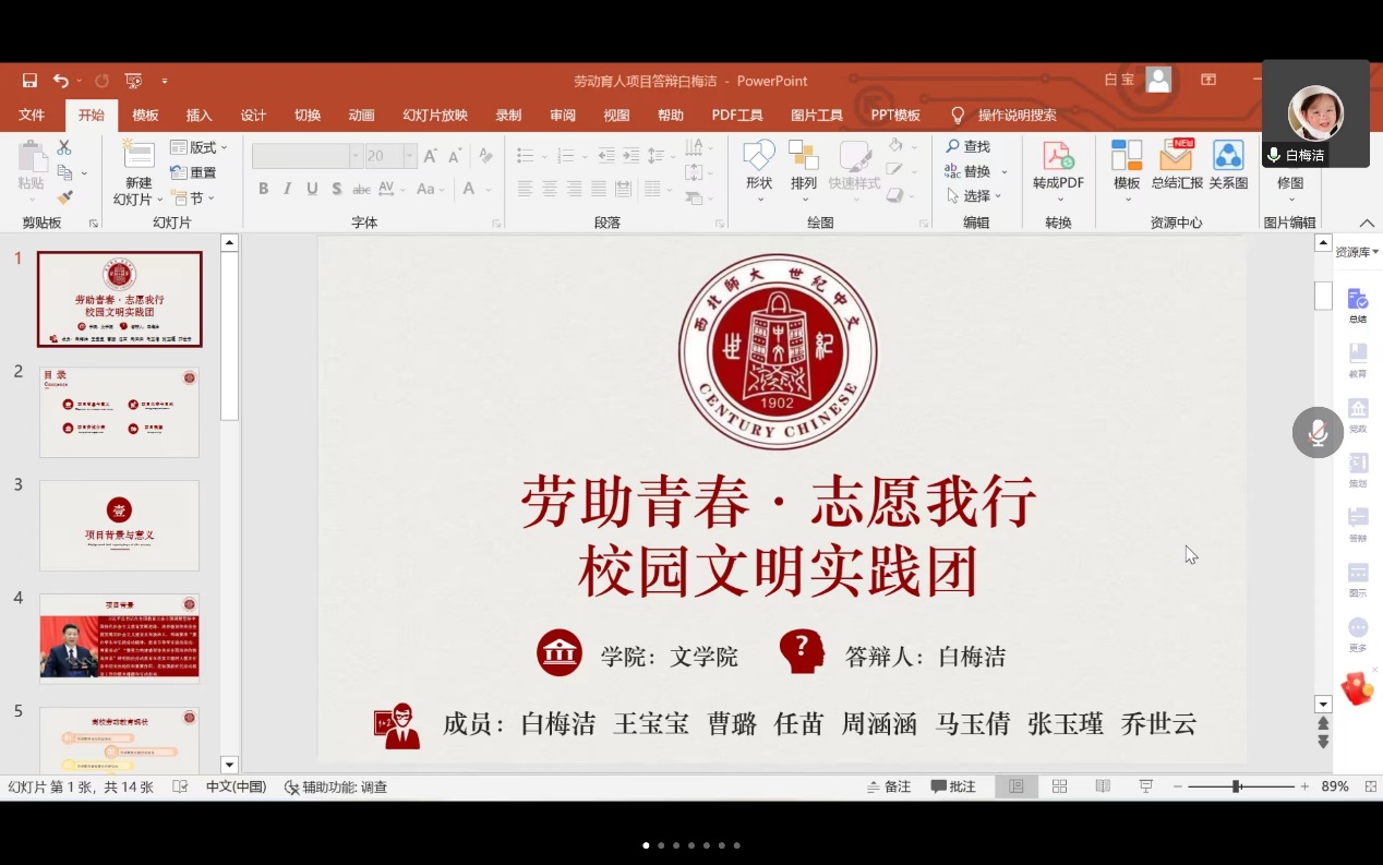 在劳动育人项目答辩中,答辩人从项目内容、项目方案、实施展望等方面进行了答辩,评委组老师们指出要细化落实方案,创新劳动教育载体,延伸劳动实践内容,立足校园和社区,带动更多同学主动参与校园文明引导、智慧助老、义务帮扶等活动中去,共同建设文明校园。