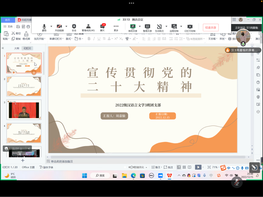 2020级汉语言文学4班在“学习二十大精神”主题班会中提到“广大青年要坚定不移听党话、跟党走,怀抱梦想又脚踏实地,敢想敢为又善作善成,立志做有理想、敢担当、能吃苦、肯奋斗的新时代好青年,让青春在全面建设社会主义现代化国家的火热实践中绽放绚丽之花。” 党的二十大报告让广大中国青年看到,伟大的新征程已经开始,奋进正当时。