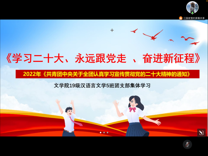 2019级汉语言文学5班团支部全体团员青年为落实《共青团我校委员会学习宣传贯彻党的二十大精神实施方案》要求,深入学习宣传党的二十大精神,全体团员青年在线集体学习党的二十大相关决议和会议精神,积极开展相关内容的研讨交流。