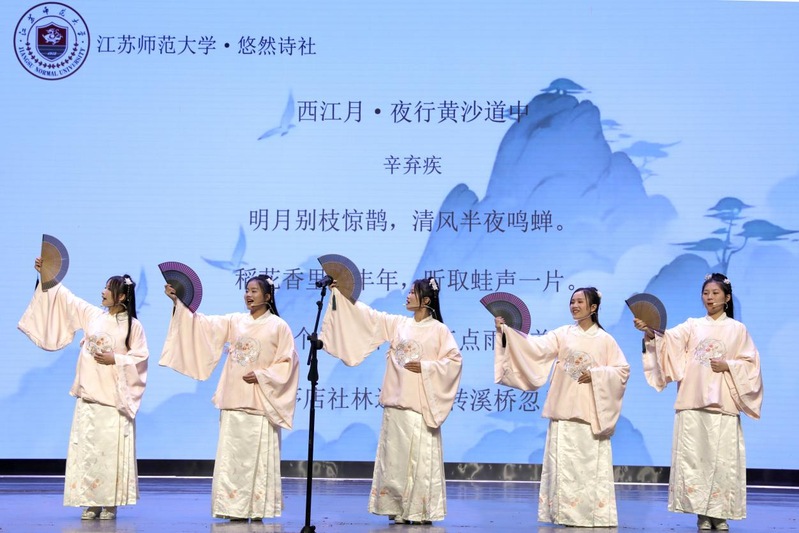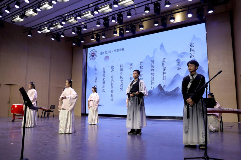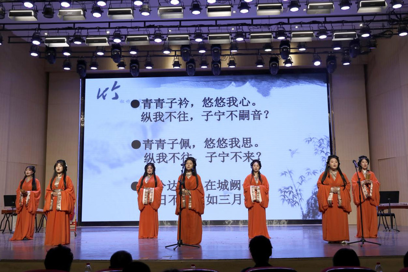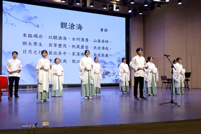晚上19点30分,西北师大音乐厅里鼓琴并作、歌声悠扬,举行了第十四届“古韵新妍”海峡两岸古典诗词联吟展演活动。甘肃省台联副会长黄跃金、甘肃省朗诵协会副主席张宇、我校副校长马世年、与会专家学者、学校相关职能部门负责人等300余名师生观看了诗词联吟展演。台湾辅仁大学东篱诗社吟唱的《观沧海》节目拉开了展演活动的序幕。北京师范大学南山诗社、中南大学中华经典吟唱团、陕西师范大学秦风诗社、江苏师范大学悠然诗社、邯郸学院学步诗社、淮阴师范学院采菊诗社、甘肃民族师范学院绿原诗社、我校子衿诗社依次登台,吟唱了27首经典诗篇,为观众带来了一场中华古典诗词吟唱的盛宴,时时引起观众雷鸣般的掌声。