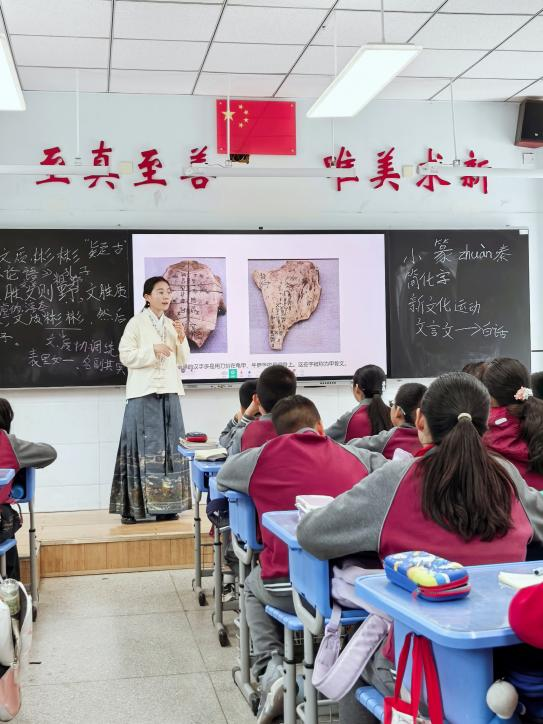 课程高度重视通识性普及教育,将授课重点聚焦于汉字的发展历程,为同学们详细介绍了汉字发展所历经的甲骨文、青铜铭文、战国文字及秦汉文字四大关键阶段。在讲解甲骨文时,采用了甲骨文字图片与实物对照分析的方法,通过直观对比,让同学们能更清晰地感受甲骨文的形态特点,深入理解这一古老文字所承载的文化信息;在讲授青铜文字时,结合大量文物图片资料着重介绍了簋、簠、豆、鬲、罍、盉、斝、尊、爵、匜等多种礼器;对于战国文字,课程着重介绍了楚简文字;在秦汉文字的讲解中,主要围绕小篆和汉隶展开。