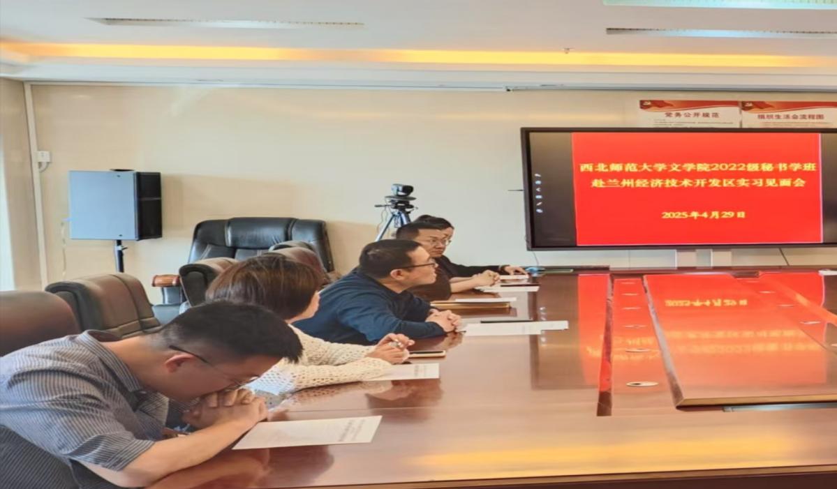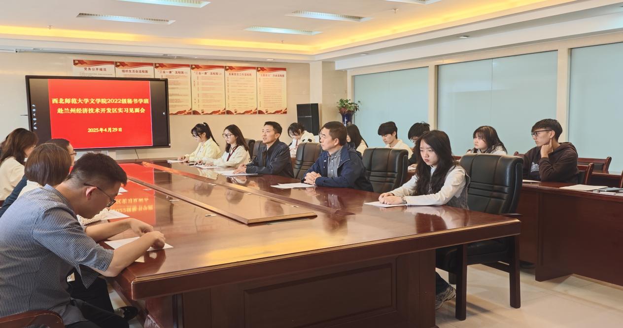 4月29日下午,学院组织秘书学专业同学赴兰州经开区进行专业实习,并与实习单位各部门负责人进行座谈。出席座谈会的有经开区各部门负责人、学院副院长李明德、实习指导老师朱生银及将要开启实习实践的11名秘书学专业本科生。